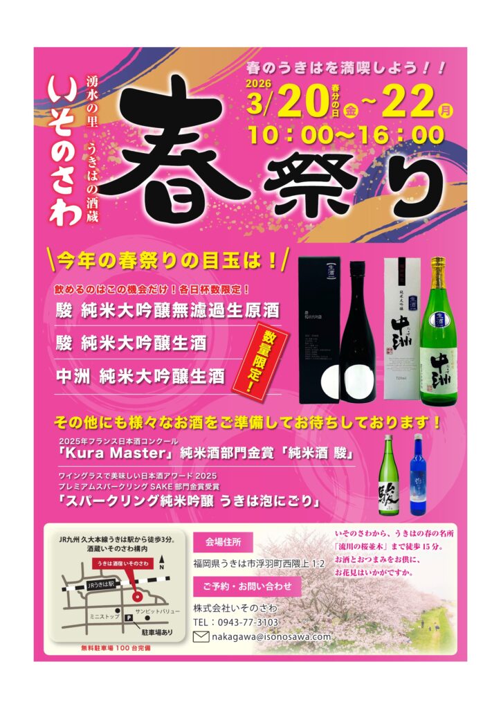 うきはの酒蔵いそのさわでは、来る2026年3月20日の春分の日から22日までの3日間、「いそのさわ春祭り」を開催します。
