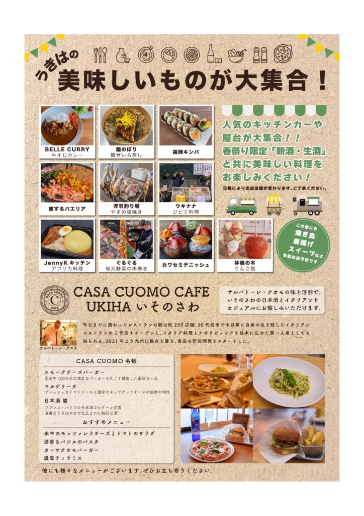 その他 : 当日は、うきは市内の飲食店が出店し、うきはの料理が楽しめます。2026年蔵開き限定、新酒純米酒しぼりたて生酒も営業中。古民家イタリアンカフェ「CASA CUOMO CAFE UKIHA いそのさわ」も営業中。また、「うきは酒宿いそのさわ」の当日の宿泊予約も受付ています。